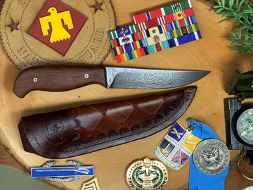 One of two knives donated to the United States Army Infantry Order of St. Maurice. Go Mai (5 layer) construction, with a core of damascus sandwiched between layers of 1084 and 15N20.