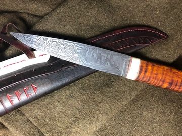 Early Migration era Viking Seax with copper/elk bolster. Sheath has bone fittings and Elder Futhark runes.