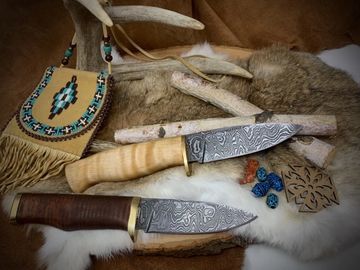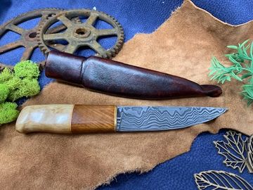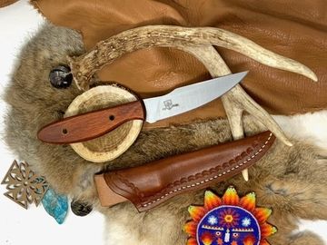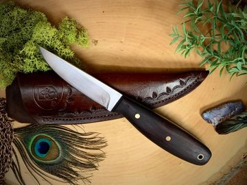 Inspired by the Canadian Belt Knife, this 8-3/4" knife has a 4-1/2" blade of 1084 with laminated Dymondwood handle and hollow pins.