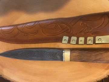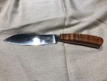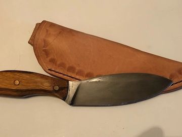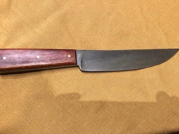 Hand forged from 1084 with brass pins. Blade 1/8" thick and 3-7/8" long. 8-1/2" OAL.