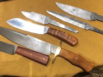 Slight trailing point in low layer damascus of 1084 and 15N20. +/- 3/16" thick blade, 5-3/8" long. 10-1/8" OAL